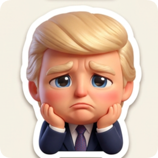 Chibi sticker pack generator featuring a cartoonish Donald Trump holding a coffee cup with a tired expression.