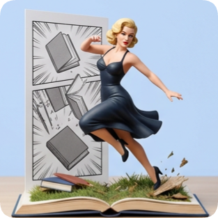 Custom Marilyn Monroe pop up book sculpture with comic book style action and flying books. cm naruto pop up book