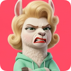 Custom CM llama character with blonde curly hair and an angry expression, wearing a mint green hoodie.
