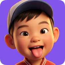 Pixar 3d cartoon boy, an American all-star boy with a baseball cap, sticks his tongue out playfully against a purple background. american all star boy