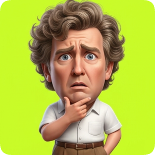 Custom 3D caricature transformation of a confused man with a hand on his chin, rendered in a cartoonish style. cm 3d caricature transformation