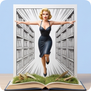 Custom CM Naruto pop up book featuring a stylized blonde woman leaping from an open book surrounded by bookshelves.