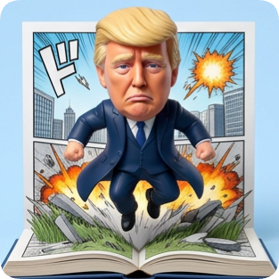 Custom CM manga pop-up book featuring a dynamic Donald Trump figure bursting from an action-packed comic panel. cm manga pop up book