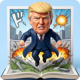 Custom CM manga pop-up book features an action figure of Donald Trump bursting from an open book with explosions. cm manga pop up book
