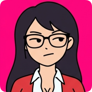 Custom cm doodle vector portrait 2 of a woman with dark hair, glasses, and a red jacket against a bright pink background.