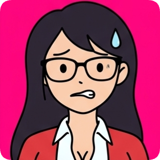 Custom cm doodle vector portrait 2 shows a nervous woman with glasses and dark hair against a bright pink background.