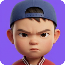 Pixar 3D cartoon boy, an American all-star boy with a blue cap, shows an angry expression on a purple background. american all star boy