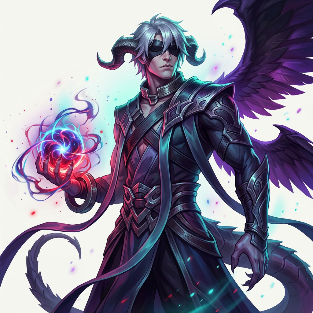 A brooding demon lord with obsidian horns and a blindfold, clutching a swirling vortex of arcane energy. His dark, ornate armor gleams under the dramatic lighting, hinting at immense power. The glowing magic in his hand is captivating. https://reeyee.ai/share/543978f4-243e-4a5f-9686-dd2772682e70