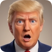 Pixar style ai avatar generator creates a surprised Donald Trump with blue eyes and blonde hair.