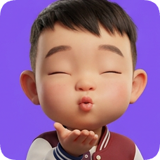 Pixar 3D cartoon boy, an American all-star boy, blows a kiss with eyes closed against a purple background. american all star boy