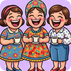 Custom CM Engelbreit folk cartoon style illustration of three laughing women holding coffee cups.