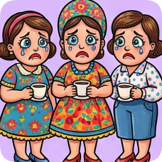 Custom CM Engelbreit folk cartoon illustration of three sad women crying while holding cups of coffee.