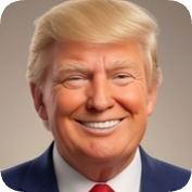 Pixar style ai avatar generator creates a smiling Donald Trump portrait with blonde hair and blue suit.