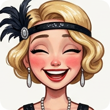Custom CM Engelbreit deco flapper caricature of a laughing blonde woman with a feathered headband and pearl necklace.