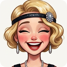 Custom CM Engelbreit deco flapper caricature of a joyful blonde woman with a sparkling headband and pearl necklace.