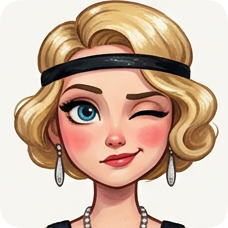 Custom CM Engelbreit deco flapper caricature portrait of a blonde woman winking with blue eyes and red lipstick.