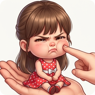 Custom cm chibi character on hand, a sad girl in a red polka dot dress, with a finger gently poking her cheek.