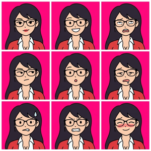 Custom cm doodle vector portrait 2 shows a woman with glasses expressing nine different emotions against a pink background.