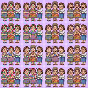 Custom cm bold chibi caricature of a woman displaying various happy and playful expressions against a blue background.